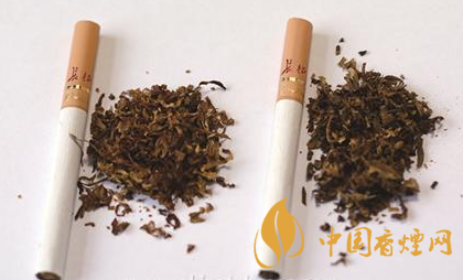 煙支過濾嘴及煙絲差異對(duì)比:真煙煙支采用單一醋纖濾嘴,長度為25mm,煙絲切絲寬度均勻,煙絲疏松、光澤油潤性好、呈檸檬黃色、含碎末少,煙絲結(jié)構(gòu)為葉絲、膨脹葉絲、膨脹梗絲和再造煙葉;假煙煙支過濾嘴較短,長度約為20mm,制絲工藝粗糙,色澤發(fā)暗無光澤、呈青褐色、煙絲中含碎末較多,大量梗絲未經(jīng)過膨脹處理,一般無膨脹葉絲和再造煙葉,與真品特征存在明顯差異。