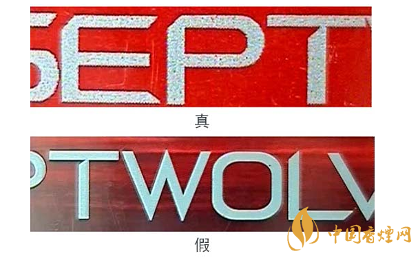 由于印刷方式的不同,真品“七匹狼”(豪情)條、盒上的中英文字體邊緣有鋸齒狀,假煙的字體邊緣光滑。