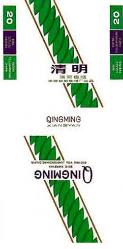 中國(guó)第一個(gè)以“清明”為牌名的煙標(biāo),是由山東益都(今青州)卷煙廠出品的“清明”煙標(biāo)。白底色的畫(huà)面上醒目的“清明”兩字,底下是拼音字母“QINGMING”。綠色的枝葉簡(jiǎn)潔而素雅,賦予了“萬(wàn)物生長(zhǎng)此時(shí),皆清潔而明凈”的含義。