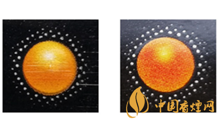 假冒卷煙:該款假煙橙色珠子平,無凸起,無立體感,無高光亮點(diǎn)。