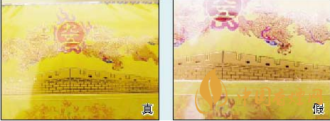 真煙上的城墻圖案印刷精致,城墻磚縫線條工整清晰;假煙的城墻圖案印刷粗糙,燙金效果差,會出現城墻磚縫線條斷開、加粗、模糊等現象。