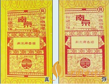 真煙條盒正面的“雙龍”、“南京”等圖案的立體感強,摸上去凹凸感明顯,底色為明黃色;假煙的“雙龍”、“南京”等圖案大都無凹凸感,底色呈黃色。