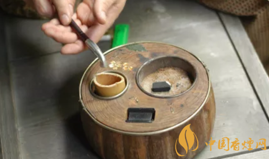 1、火入——是裝載火種的“火盆”。在使用時,現(xiàn)將火入內(nèi)放入碳灰,再將燃燒的煤炭埋在火盆中央,便于點燃煙草。在使用之前,先要將之前燃燒殆盡的煙灰裝進火入中,大概裝1/3-1/2即可。然后用火鉗夾取正在燃燒的木炭,將其放入火入。
